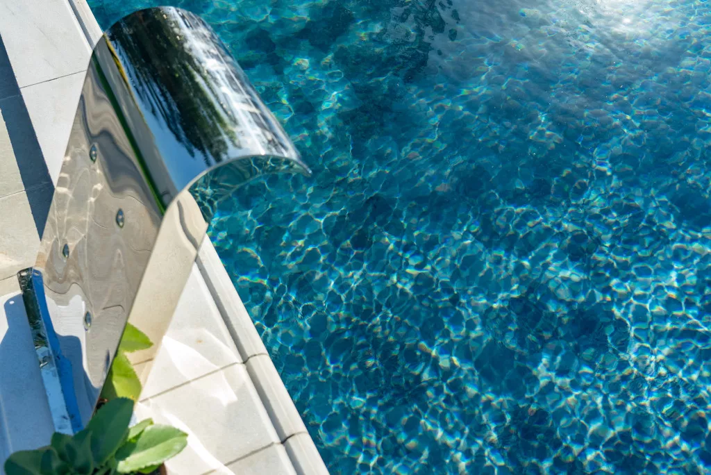 A szürke árnyalatok harmonikusan olvadnak össze a víz tükröződésével, kifinomult, modern hangulatot teremtve, amely egyszerre megnyugtató és luxusérzetű.